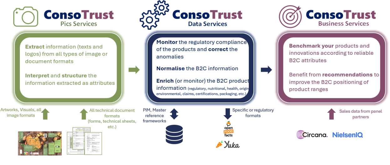 With ConsoTrust, Artificial Intelligence helps you streamline and secure your product data. The platform enables automation at every stage of the product data lifecycle: collection, input, control, enrichment, and analysis. Benefits for your business: